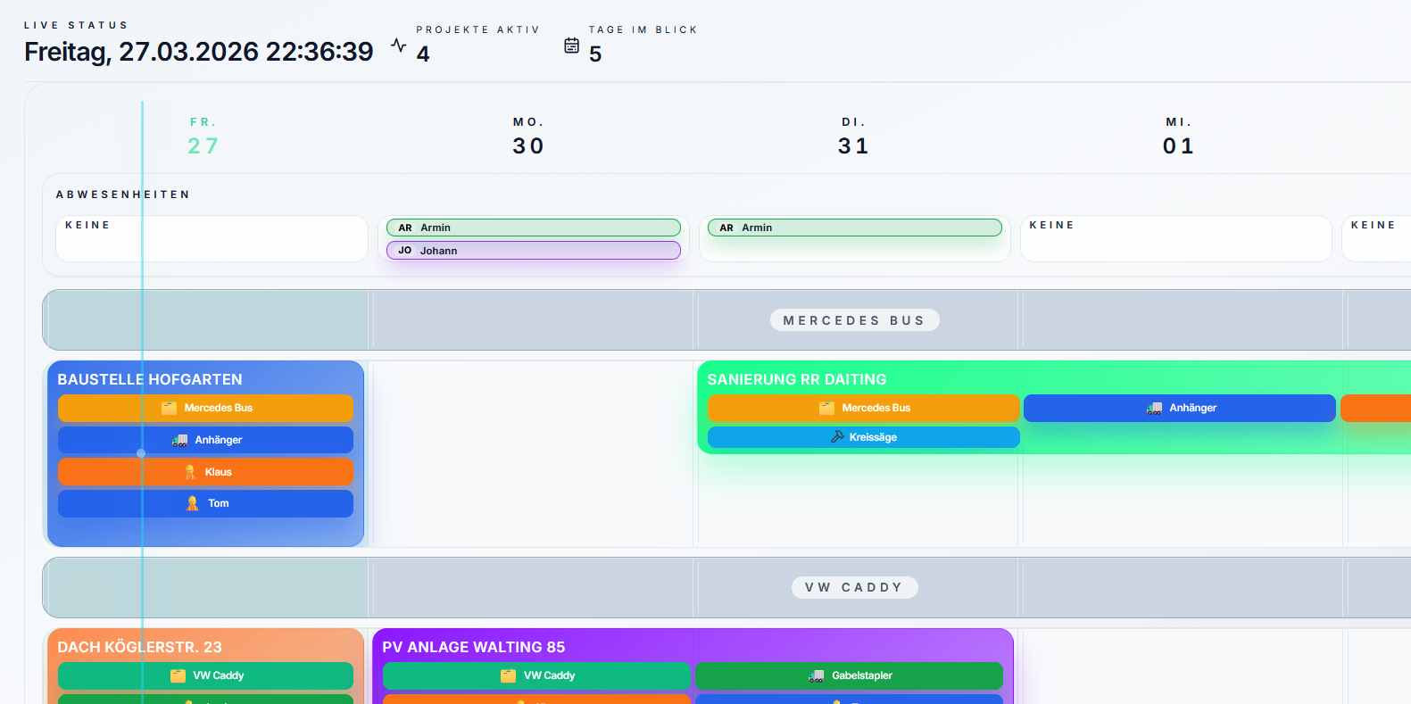 Weisen Sie Projekte tagesgenau zu und planen Sie Mitarbeiter, Fahrzeuge und Geräte effizient ein.